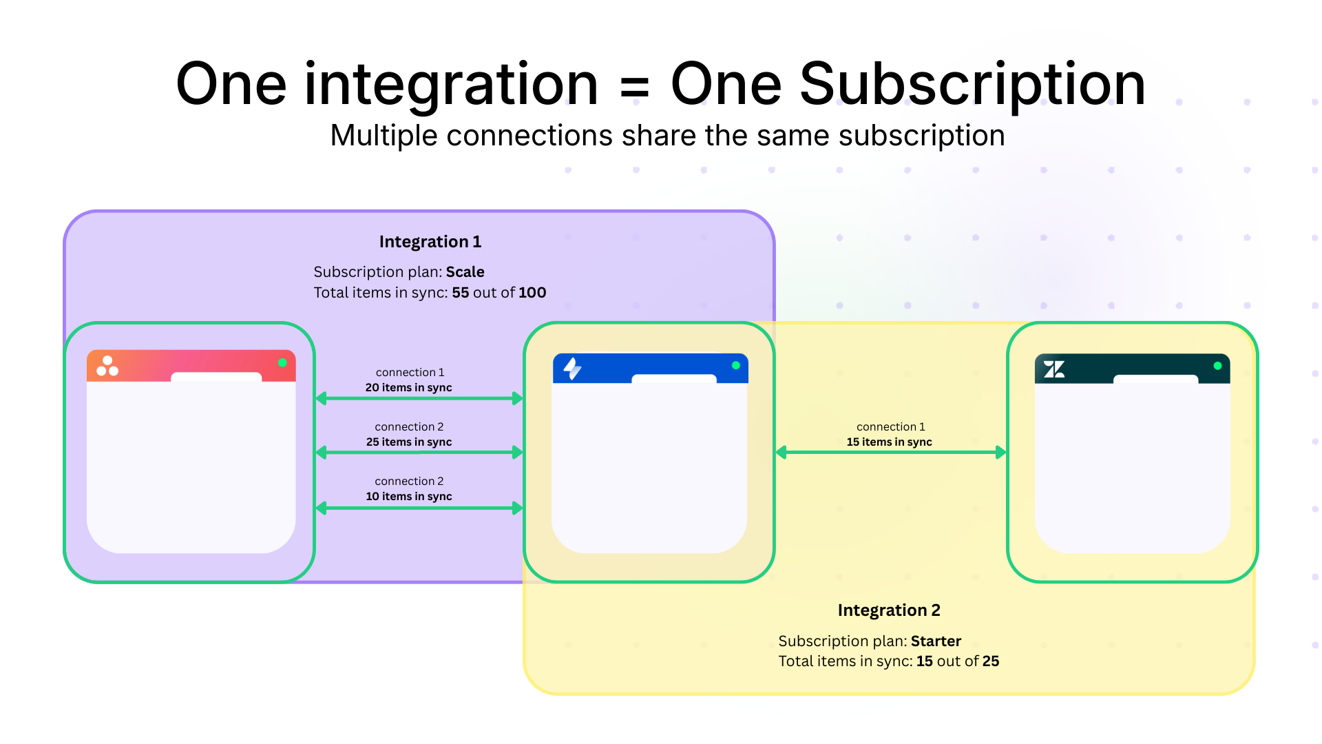 Why separate billing per integration? Because it's fairer to you. Your Jira-to-Zendesk integration might only need 15 entities in sync (Starter plan), while your Jira-to-ServiceNow integration handles 80 entities (Scale plan). Why should you pay Scale pricing for both when one integration is much lighter? Separate billing means you only pay for the capacity each specific integration actually needs – not bundled pricing that forces you to overpay for smaller use cases.